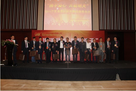 會上著重對2011年的工作進行了總結,在產品研發、品牌深化、營銷服務、市場監管等幾大方面進行了探討,2011年是充滿機遇與挑戰的一年,江蘇通用銷售額達到43.14億,同比增長57%,年產輪胎達1744865條,這不僅是市場需求的見證,更是企業品牌得到認可的體現。隨著市場經濟的發展,江蘇通用不斷調整企業步伐,在產品研發上下足了功夫,使輪胎產品總類更為齊全,品類更為豐富,充分滿足各地區市場的需求。在頒獎環節上,集中對2011年涌現出得優秀經銷商進行了表彰,共頒發出成就獎12名,潛力獎9名。江蘇通用董事長顧瑞表示:2012年是江蘇通用科技股份有限公司的品牌發展之年,公司上下將嚴把產品質量關,逐步提升產能,在通用全鋼二廠投產后,逐步形成年產400萬套的產能釋放,并將公司上市列入到計劃中來,穩步踏準市場節拍,以順應市場的需求。