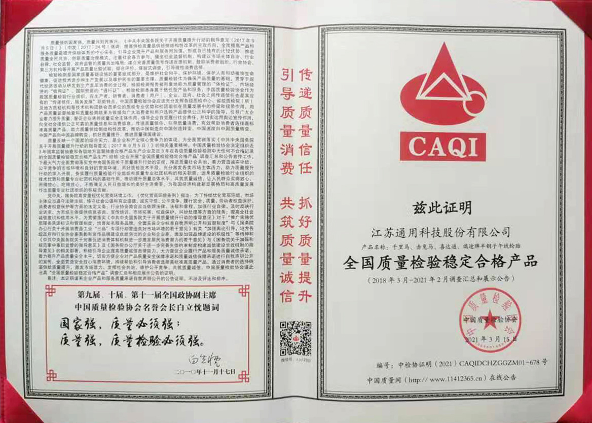 產(chǎn)品質量是企業(yè)發(fā)展的基礎,作為中國民族輪胎領軍企業(yè)之一,通用股份秉持“讓每一條輪胎成為精品”的企業(yè)使命,全方位深耕質量管理,建立了嚴苛的產(chǎn)品質量標準,完善的內部質量監(jiān)控和管理體系,并形成了獨具特色的《質量三字經(jīng)》、《輪胎當自強》等質量文化,從思想上引導、提升、深化全員質量意識。公司從原材料采購、生產(chǎn)制造到產(chǎn)品出廠,全面貫徹“質量一票否決制”,一旦有產(chǎn)品質量方面的問題,絕對不允許進入下一道工序,嚴把質量關,確保為客戶提供高質量的優(yōu)質產(chǎn)品。