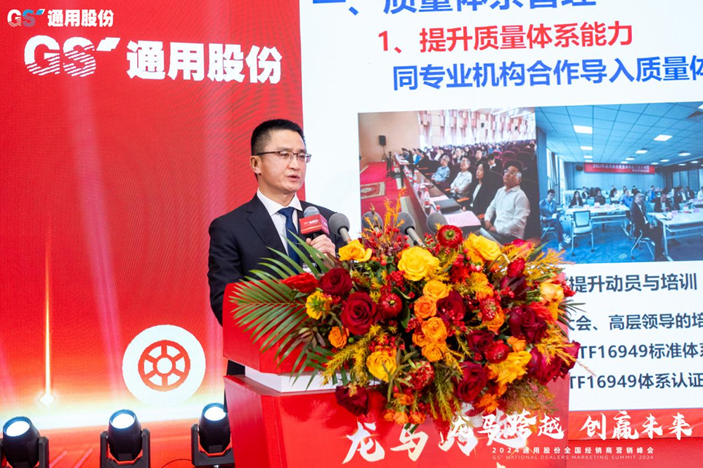 因勢而謀,順勢而為;前瞻布局,方能遠行。通用股份董事長顧萃做總結講話,感謝經銷商朋友們長期以來和通用股份的攜手共進和互相支持。他強調在周期突變要做好戰略謀劃,保持戰略定力,增強發展信心。近年來公司加速產業轉型升級,成功打造海外雙基地、國內半鋼“黑燈車間”、全鋼“5G碳云工廠”高端智造模式引領行業升級,2023年通用股份營業收入、全球銷量和盈利能力實現新增長。展望2024,公司將重點“打造三項工程、錘煉五種能力”,即品牌工程、人才工程、5X基地工程,研發能力、營銷能力、制造能力、降本能力、組織能力,強基固本激發活力,加速“百億通用”步伐,與各位經銷商堅定信心、龍馬跨越,緊咬目標不放松,開啟高質發展新征程!