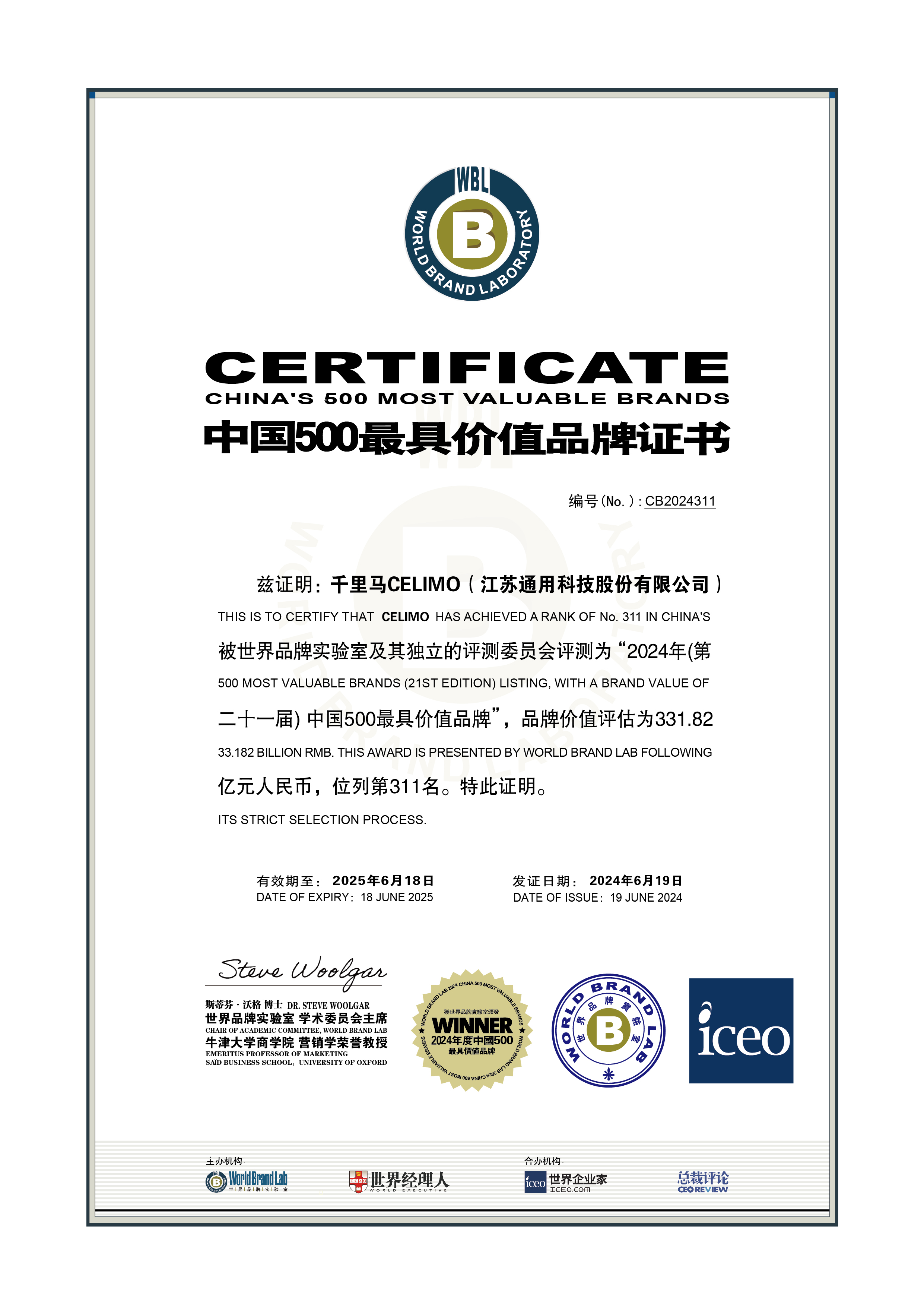 6月19日,世界品牌實(shí)驗(yàn)室(World Brand Lab)主辦的第二十一屆“世界品牌大會(huì)”在京圓滿(mǎn)落幕。會(huì)上隆重揭曉了2024年“中國(guó)500最具價(jià)值品牌”榜單,通用股份旗下千里馬CELIMO品牌憑借331.82億元人民幣的品牌價(jià)值,排名躍升至榜單第311位,連續(xù)六年獲此殊榮,彰顯了其強(qiáng)大的品牌實(shí)力。