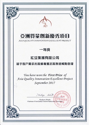 9月26日-27日,第二屆亞洲質(zhì)量功能展開(kāi)與創(chuàng)新研討會(huì)在杭州舉行,紅豆集團(tuán)發(fā)表的“基于客戶需求的連鎖專賣店服務(wù)接觸點(diǎn)管理”項(xiàng)目,榮獲亞洲質(zhì)量創(chuàng)新優(yōu)秀項(xiàng)目一等獎(jiǎng)。國(guó)家質(zhì)檢總局質(zhì)量管理司副司長(zhǎng)陳曉波,亞洲QFD協(xié)會(huì)會(huì)長(zhǎng)、國(guó)際著名質(zhì)量專家、日本戴明獎(jiǎng)評(píng)審委員長(zhǎng)新藤久等國(guó)內(nèi)外知名專家學(xué)者擔(dān)任本次研討會(huì)嘉賓,現(xiàn)場(chǎng)共有200余家企業(yè)參加本次研討會(huì)。紅豆等30余家企業(yè)進(jìn)入研討會(huì)現(xiàn)場(chǎng)發(fā)表環(huán)節(jié),經(jīng)專家評(píng)審和企業(yè)答辯,紅豆集團(tuán)等10家企業(yè)發(fā)表的項(xiàng)目得到評(píng)審組高度認(rèn)可,榮獲一等獎(jiǎng)。