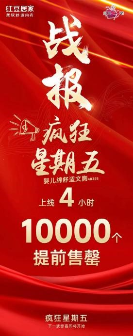 紅豆有禮,約“惠”七夕。7月下旬,在第24屆紅豆七夕節(jié)IP的強(qiáng)力加持下,紅豆居家通過(guò)精心策劃的“瘋狂星期五”營(yíng)銷活動(dòng),每周精選一款兼顧舒適悅己與高性價(jià)比優(yōu)勢(shì)的品質(zhì)好物,限時(shí)秒殺、限量搶購(gòu),掀起了現(xiàn)象級(jí)消費(fèi)熱潮。首波主推的嬰兒綿舒適文胸在短短10小時(shí)內(nèi)狂銷1萬(wàn)件,第二波活動(dòng)更攀新高,創(chuàng)下4小時(shí)售罄1.2萬(wàn)件文胸的驕人戰(zhàn)績(jī),再次證明了“紅豆”品牌背后的硬核產(chǎn)品力和強(qiáng)大市場(chǎng)吸引力。